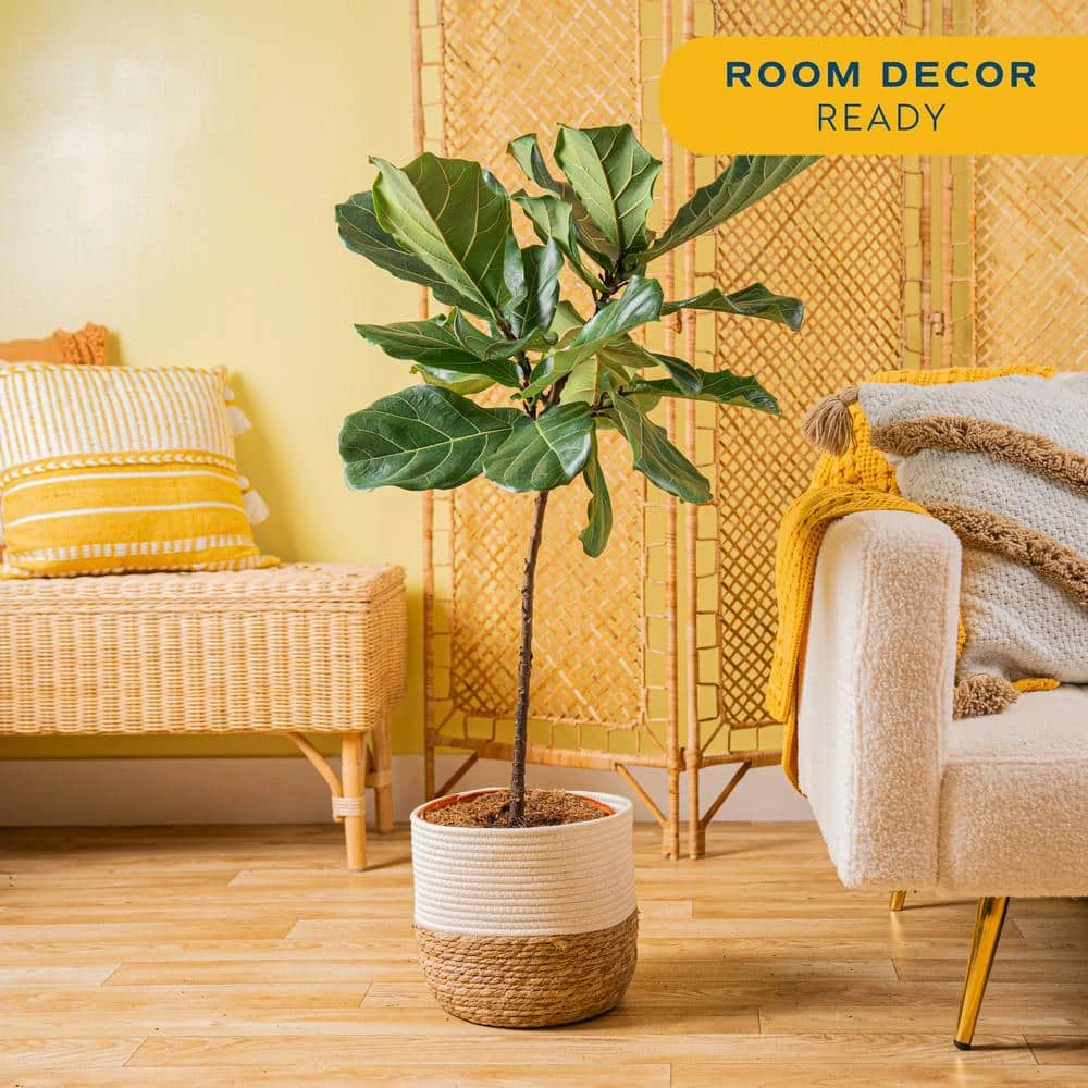Enhance your living area with this Fiddle Leaf Ficus plant from Costa Farms. This eye-catching plant has large, dark green leaves that add a rich tropical look to a bedroom, living room, or sunroom. Not only are Fiddle Leaf Figs striking and hearty, they help purify the air by removing unhealthy organic compounds. Research also shows that adding plants to your home also may help you feel happier and calmer. Comes in a 10 in. white planter.