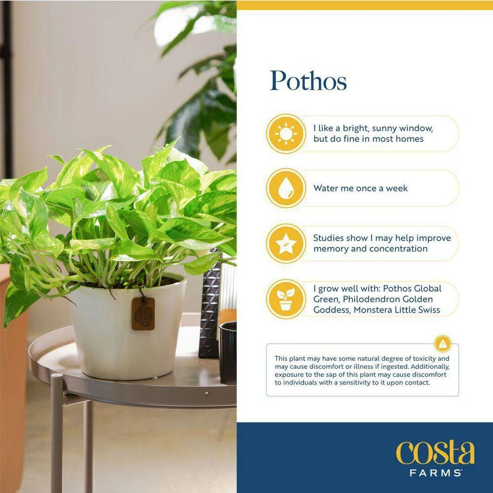 Looking for a new variety of variegated pothos. Global Green may be your answer! This easy-care plant features leaves irregularly mottled with light and dark green, giving it a chic look. It is grown and shipped fresh from our Florida farm to your home.